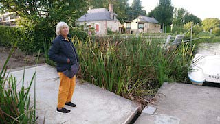 Et rien du tout pour ancrer le bateau. Il a trouvé quand même sa cachette et nous buvons notre soupe et notre vin rouge sur un banc tout en contemplant le spectacle des habitants de Laval qui font leur sport ou promènent leur chien. Le lendemain, Jippy m'en veut encore mais comme j'ai bien dormi ! Et la rivière déroule ses fastes, toc, toc. Les jardins passent, ceux qui sont somptueux et d'autres. Le bruit devient infernal car nous allons bientôt passer sous une autoroute. Les jardins et les sam'suffit qui les possèdent sont de plus en plus modestes. Quelle tristesse de penser à ces petites gens qui s'étaient construit un paradis et qui sont maintenant dans les hurlements des voitures. Cerise sur le gâteau, derrière le pont autoroutier, il y en a un autre : c'est la ligne de chemin de fer à grande vitesse.