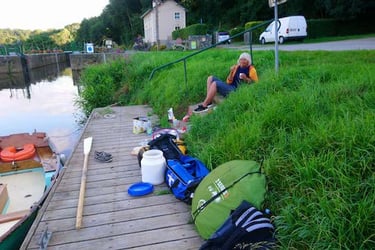 Finalement, nous avons mis à l'eau notre petit moorskoul à Menil où un terrain de camping était disposé à garder la remorque et la voiture. C'était le 27 Juillet 2021.Décidés à nous alléger , nous renonçons à la voile. Nous ferons tout le trajet à la godille. Après tout, aller et retour jusqu'à Mayenne, nous n'avons à faire que 156 kms. Pourquoi pas ?