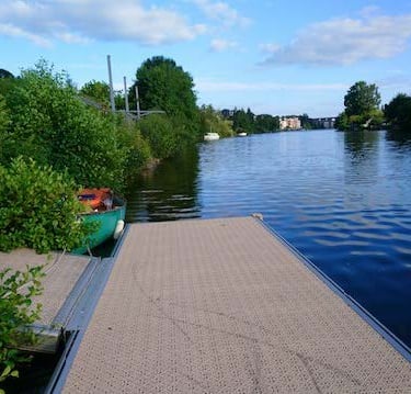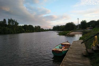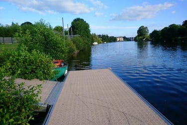 C'est le jour de mon anniversaire. Il est clair que nous faisons un festin. Pour notre deuxième étape, nous pensons atteindre Laval. Mais encore, fraudra-il bivouaquer mais pas en pleine ville quand même. En attendant, comme il est mignon notre bateau prêt à partir. Comme la rivière est accueillante ....
