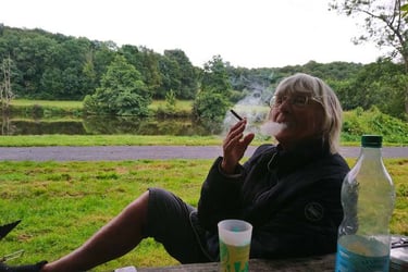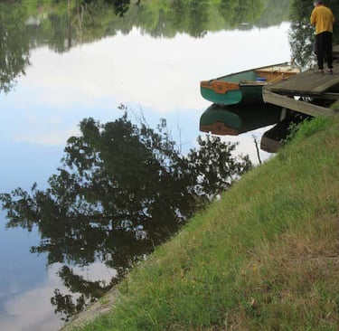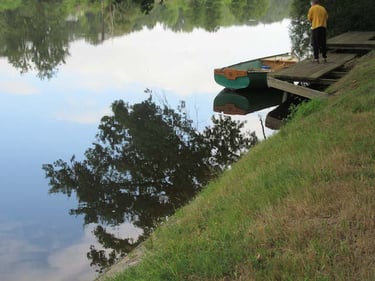 Dans les grands petits événements qui ne manquent pas d'arriver, les relations avec les pêcheurs sont un souci. Généralement, Jippy les voit et commence à leur raconter sa vie d'une voix à faire fuir les poissons les plus sourds. Mais nous n'avons pas eu de collision avec les lignes fatales sauf... Aujourd'hui, il faisait donc un temps détestable mais quand le vent se calmait, nous avancions bon train. J'étais à l'aviron quand un être ventru se met à hurler sur la rive. Apparemment, ses lignes étaient prises dans le Postellec. Il était à l'abri dans sa voiture quand notre bateau passait. Fort aimablement, je fais demi-tour, nous décrochons ses lignes et ce Monsieur sans remercier prend un air boudeur et surtout offensé. Par la suite, j'ai observé que les vrais pêcheurs pêchent. Ils ouvrent les yeux, surveillent leur matériel. Mais celui-là !