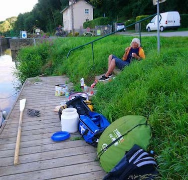 Nous le remercions vivement car c'est une vraiment bonne personne. Nous retrouvons notre fantasque Mathieu qui n'éprouve aucune lassitude à tourner les roues des ventelles des portes, des portes et des ventelles et de recommencer 500mètres plus loin. Le courant est à peu près nul mais il est plus facile de descendre que de monter. Nous échappons aux cataractes. Nous faisons connaissance avec une famille qui roule avec trois enfants dont un bébé. A la guinguette, nous invitons Mathieu à prendre un pot. Il adore sa vie . N'importe quel travail lui plaît. Il aime juste la liberté. Sa grand-mère écrivain est comme lui et sa mère aussi, licenciée en philosophie.