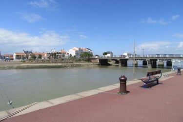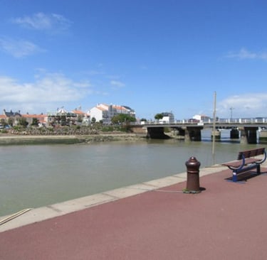 Je l’ai eu, mon café sur le port et comme je suis sur un véloroute, je fais la conversation avec deux voyageurs en tandem type Chaloin qui m’annoncent une superbe route vers les Sables d’Olonne. Pourtant , ça commence mal. Me voici sur une départementale pleine de voitures. Mon GPS me trahirait_il ? D’habitude, il pèche par l’excès inverse. Mais avec ces canaux partout, il n’a peut-être pas le choix et effectivement, je tombe tout d’un coup sur le bord de mer et le spectacle d’une immensité radieuse et différente quoique très boueuse : la tempête a remué la vase. Mais le contraste avec ma route de ce matin est saisissant. C’est ce qui fait le charme du voyage en vélo : chaque instant est éternel, chaque paysage unique, chaque souci taraudant (trouverai-je de l’eau ?) chaque solution exaltante. Bref, je glisse sans histoire entre les dunes et les vagues sur un chemin bien aménagé. Et puis se présente un charmant petit port sur une rivière, et puis une forêt et puis il faut croire, bientôt, viendront les Sables d’Olonne.