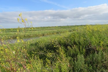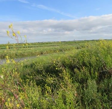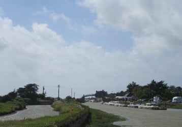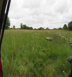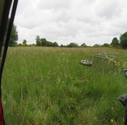 A 16heures trente, ce n’est pas l’heure mais je m’arrête. Le vent assez fort est de face. Je m’approche de La Rochelle. J’ai roulé sur un tronçon d’une route trop passante, puis bifurqué sur des voies secondaires qui sautent par-dessus des canaux. Mais, comme je l’ai déjà dit, l’après-midi, les kilomètres sont interminables. Je pense à me poser, toutefois sans conviction quand je stoppe debout sur les freins. Je viens d’apercevoir une trouée dans les hautes herbes qui longe un canal. Une barrière maintient les voitures au-dehors, un écriteau annonce je ne sais quoi. Bingo, c’est chez