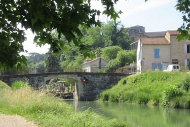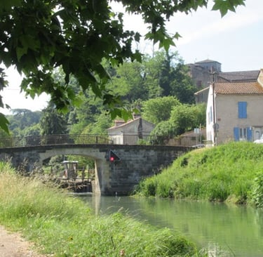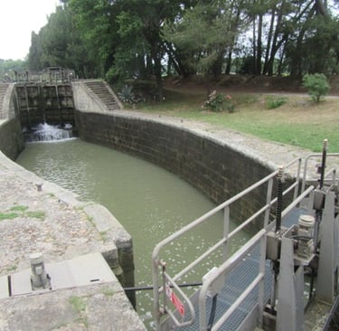 Depuis ce matin,, je suis sur le canal qui longe la Garonne. L’eau est verte, les arbres hauts et épais, majestueux. Il n’y a pas d’algues comme sur la Vilaine. Tout y est : écluses, péniches ports. Mais quels sauvages ! En 40kms je n’ai rencontré qu’un seul troquet. Heureusement que j’avais consulté mon téléphone à La Réole pour découvrir une boulangerie car sur ma route, il n’y a rien...
