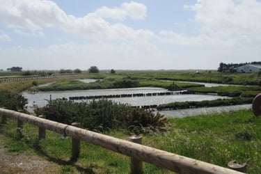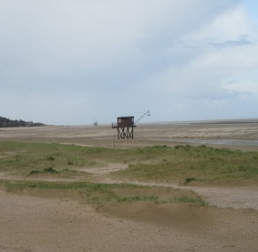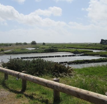 Joyeux voyage jusqu’à Royan. Propre, bien habillée, bonnes jambes. Je me suis préparée à passer la Gironde. Surprise, j’ai encore traversé un marais, peut-être un marais salant, en tous les cas un endroit pour faire pousser les huîtres. C’est fou comme on ne connaît pas la France car enfin, je suis