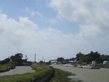 A 11 heures 30, je découvre que je suis à l’orée du Marais Poitevin. C’est une bonne nouvelle car je ne suis pas si bête. Je le surveille mon besogneux petit GPS grâce à mon smart phone qui est moins poétique mais aussi beaucoup moins myope. Je l’ouvre de temps en temps pour avoir des nouvelles de ma position et de son contexte et j’avais justement repéré que suivre la côte de trop près n’était pas une bonne idée. Il n’y a pas grand-chose à voir sur cette photo sauf que justement, il y a une vingtaine d’années, Jippy et moi, nous avions fait une halte à Maillezais, chez Rabelais, et que nous nous étions fait promener sur les infinis canaux. Je m’étais posée la question de ce qui se passait au bord de la mer. Et pile, j’ai la réponse. Je l’aurai bien meilleure dans quelques kilomètres car je débouche sur de grands espaces traversés par des canaux que je passe sur de beaux petits ponts.