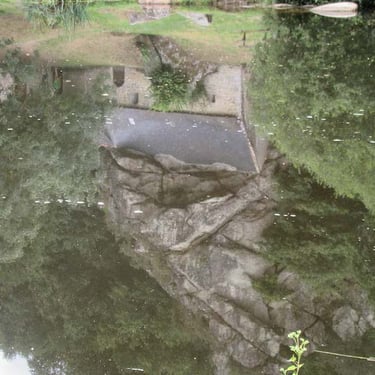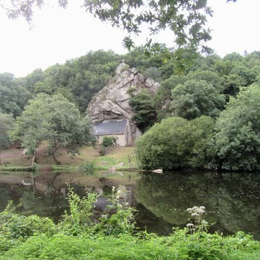 Parmi les merveilles très photographiées du Blavet, il y a la chapelle, St Gildas tête en haut, tête en bas, avant St Nicolas des Eaux . Nous n'irons pas plus loin que St Nicolas car se trouve dans ce lieu champêtre et aquatique, quoi donc, un camping !